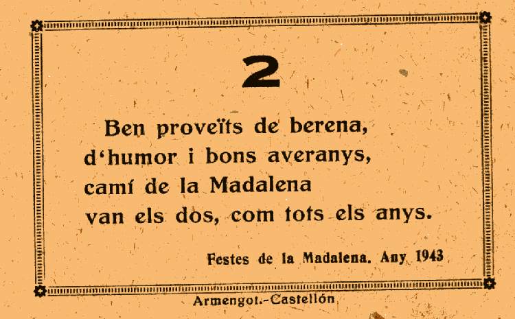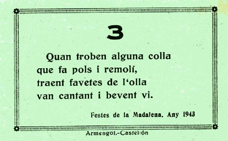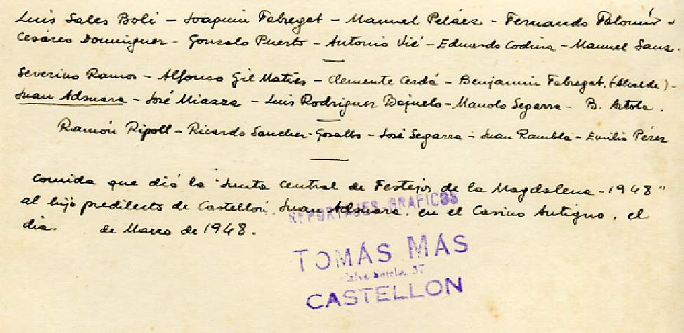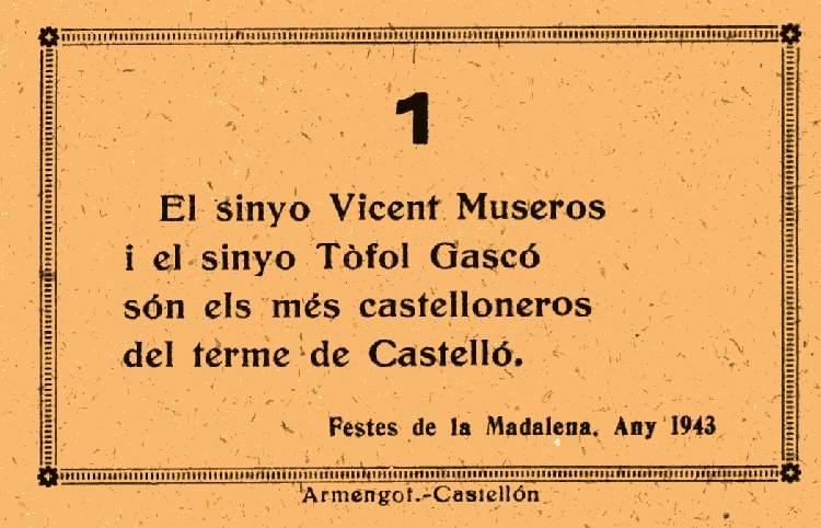 Poco a poco se esbozan las Fiestas de la Magdalena, en su diseño actual, y se realiza la "Gaiata" denominada "BON PIT BON CÀNEM", en la que aparecía "Tomba Tossals" junto al campanario de Castellón. De la misma se diseña un retablo de azulejos, uno de los cuales fue donado al Ayuntamiento de Castellón, otro se conserva en el archivo familiar