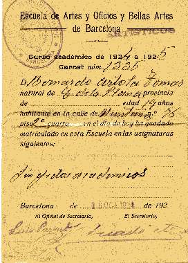 Curso 1924-1925 Escuela de Artes y Oficios y Bellas Artes de Barcelona (se matricula sin efectos académicos).