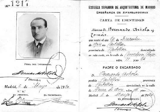 Bernardo Artola Tomás nació a las 2 de la tarde del día 20 de Diciembre de 1904, en la calle Caballeros número 62, de Castellón, y falleció en Madrid a las 2 de la tarde del día 8 de Mayo de 1958.
