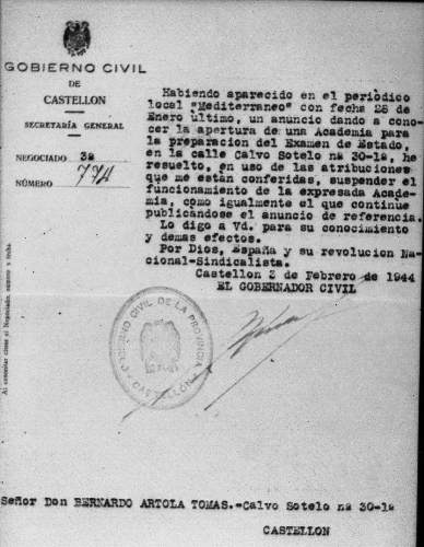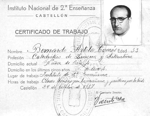 El 4 de Octubre de 1937 es designado por el Instituto Nacional de 2ª Enseñanza de Castellón, para la Cátedra de Lengua y Literatura.