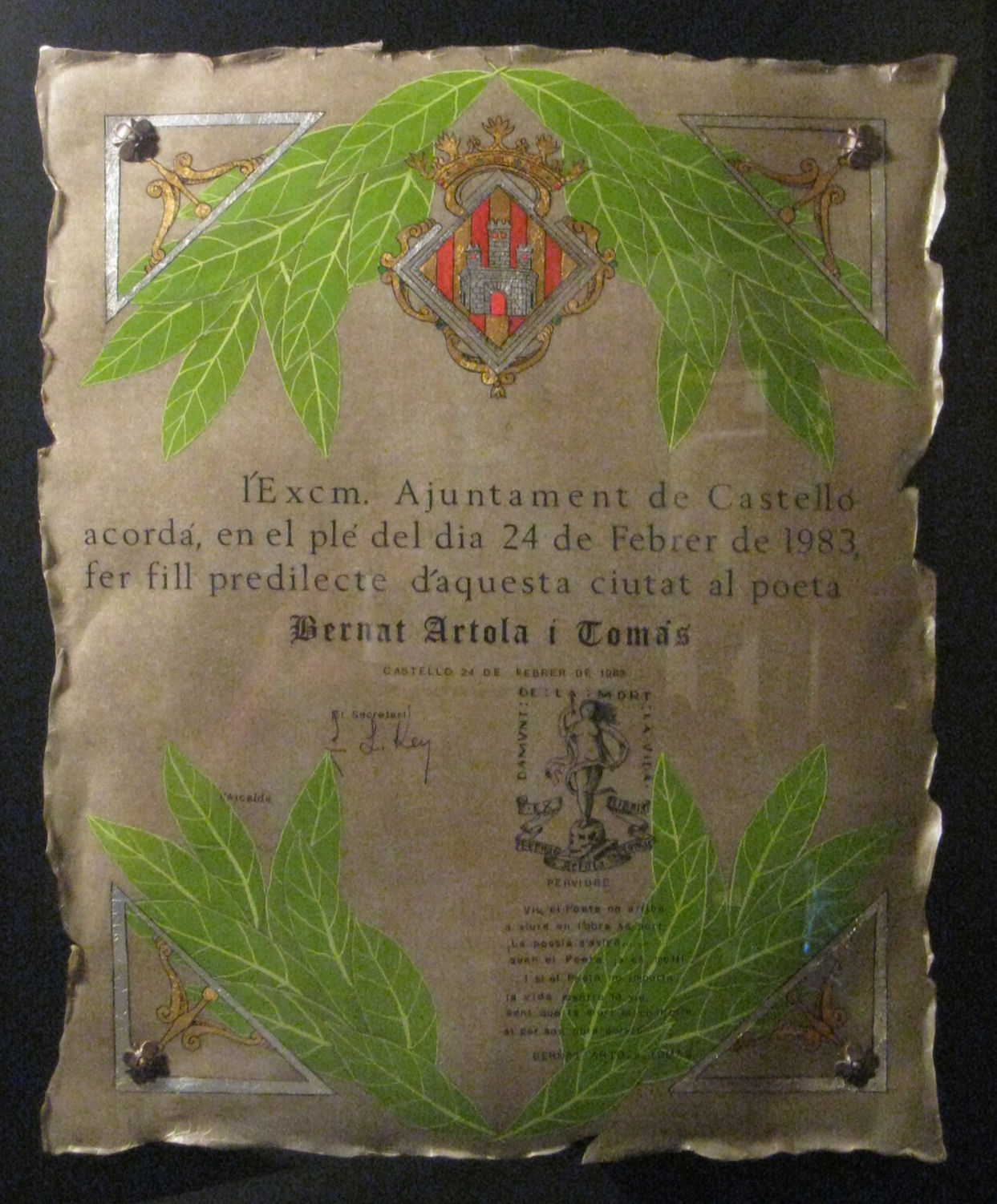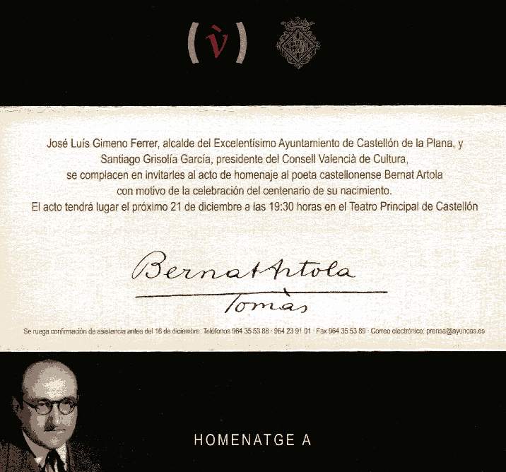 Por esta época el Excmo. Ayuntamiento de Valencia le dedica una calle con su nombre "Calle Poeta Artola", y más tarde el Excmo. Ayuntamiento de Castellón otra con el nombre "Calle Bernat Artola".