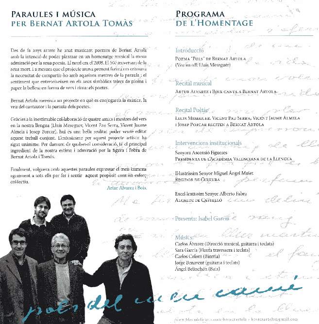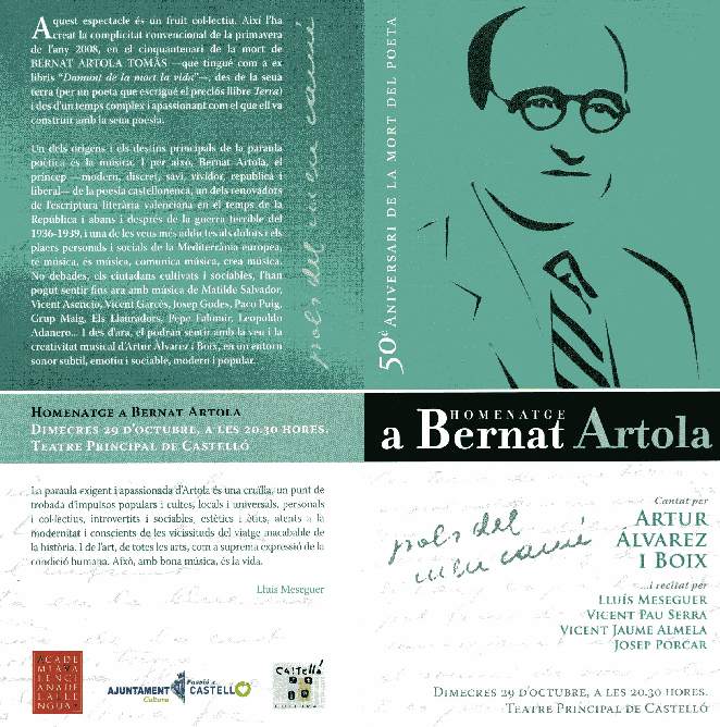 El 29 de Octubre del año 2008 con motivo de la celebración del 50 aniversario de la muerte del Poeta, la Academia Valenciana de la Llengua y el Excmo. Ayuntamiento de Castellón organizan un acto homenaje en el Teatro Principal de Castellón presentando un doble CD con poemas musicados por Artur Alvarez. i Boix. Después de las intervenciones del Excmo. Sr. Alcalde y de la Excma. Sra. Directora de la Academia de la Llengua Valenciana, se interpretan diversas composiciones editadas en el CD, alternando con poemas recitados por Lluis Messeguer, Vicent Pau Serra, Vicent Jaume Almela y Josep Porcar. Un cálido y entrañable homenaje.