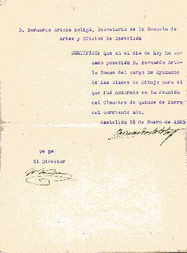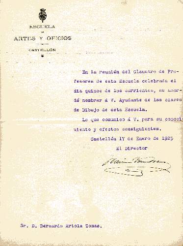 El 17 de Enero de 1925 es nombrado Profesor Ayudante de Dibujo de la Escuela de Artes y Oficios de Castellón.