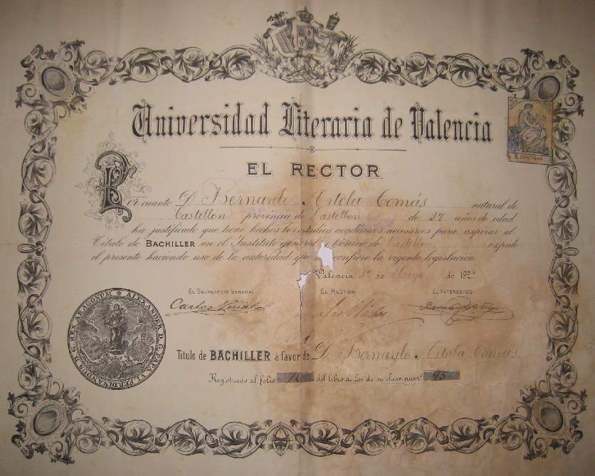 Finalizó los estudios de Bachillerato en el año 1922 solicitando el Título correspondiente que le fue otorgado por el Rectorado de Valencia el día 8 de Mayo.